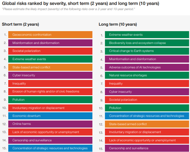 - Inteligência Artificial: deixou de ser uma preocupação restrita a nichos especializados e passou a integrar o grupo dos cinco principais riscos de longo prazo.